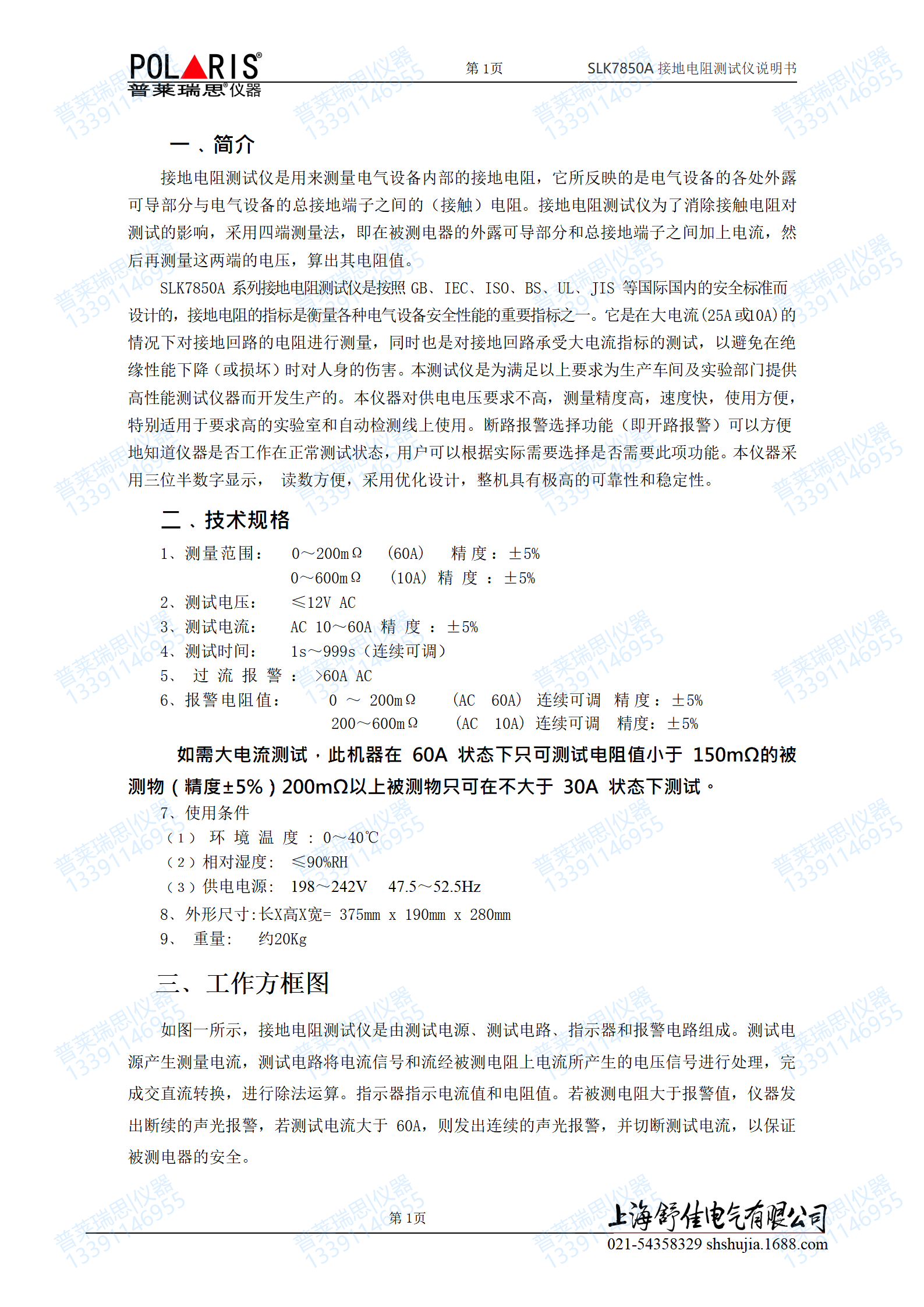SLK7850A 系列接地电阻测试仪是按照 GB﹑IEC﹑ISO﹑BS﹑UL﹑JIS 等国际国内的安全标准而设计的,接地电阻的指标是衡量各种电气设备安全性能的重要指标之一。它是在大电流(25A 或 10A)的情况下对接地回路的电阻进行测量,同时也是对接地回路承受大电流指标的测试,以避免在绝缘性能下降(或损坏)时对人身的伤害。本测试仪是为满足以上要求为生产车间及实验部门提供高性能测试仪器而开发生产的。本仪器对供电电压要求不高,测量精度高,速度快,使用方便,特别适用于要求高的实验室和自动检测线上使用。断路报警选择功能(即开路报警)可以方便地知道仪器是否工作在正常测试状态,用户可以根据实际需要选择是否需要此项功能。本仪器采用三位半数字显示, 读数方便,采用优化设计,整机具有极高的可靠性和稳定性。